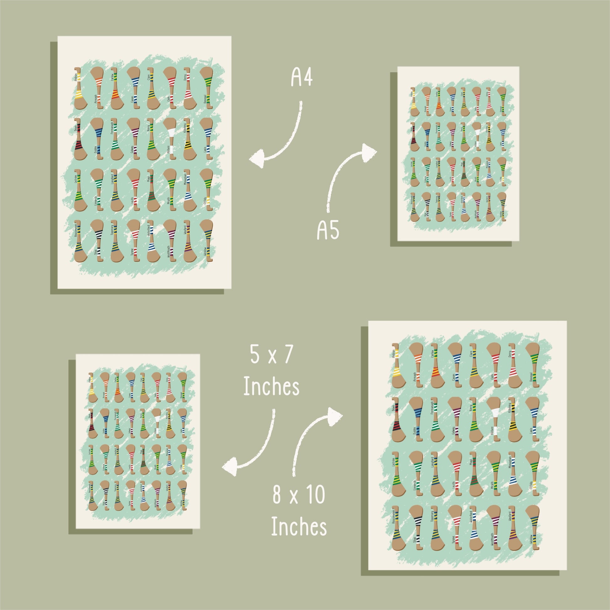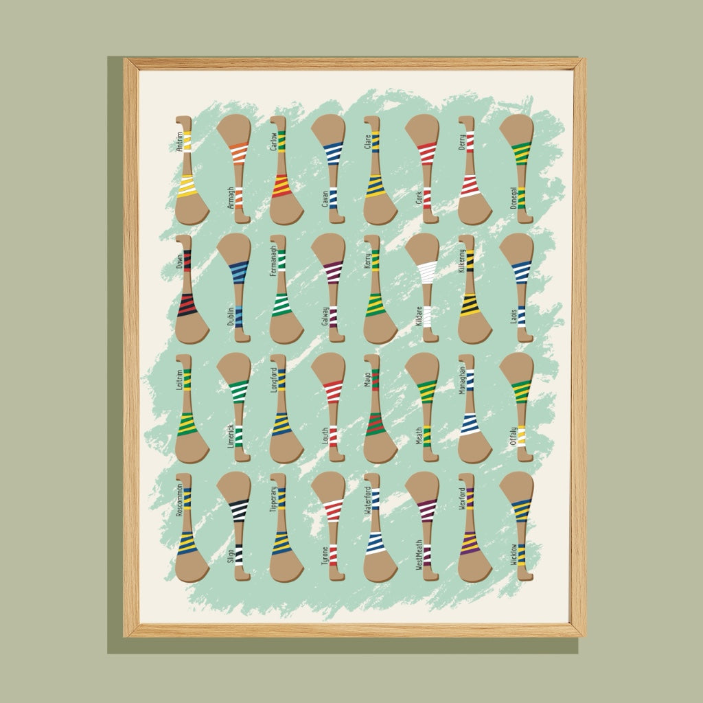 Celebrate Ireland’s sporting spirit with this colourful County Hurls Print, featuring 32 hurls wrapped in the traditional colours of each county. Every hurley is paired with its county name, making it a perfect nod to Irish pride and hurling heritage.