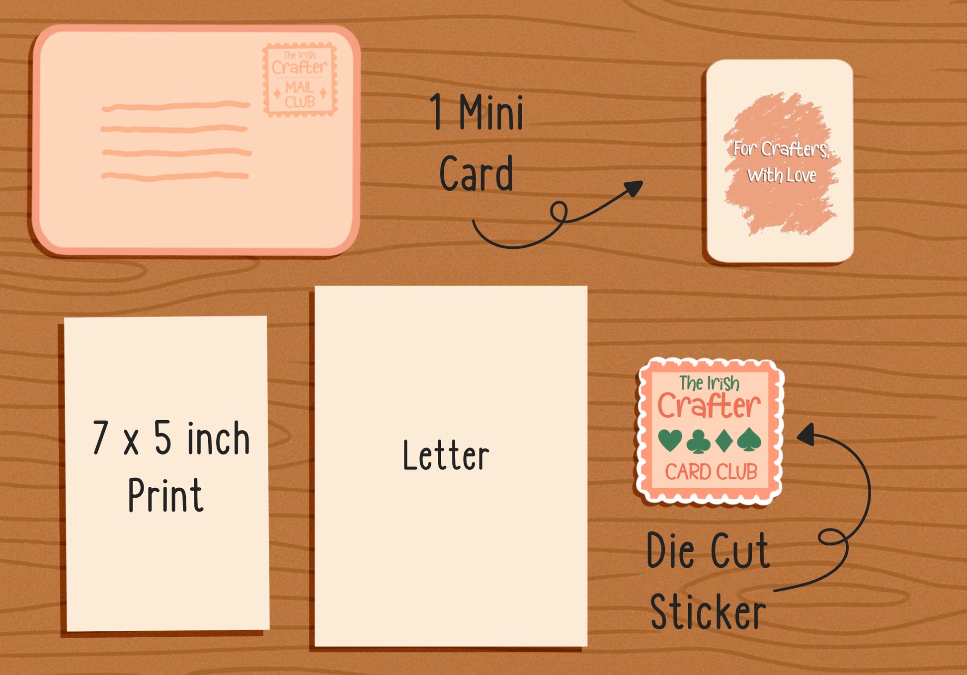 Each month you will receive a 5x7 inch print that I have designed specifically for mail club, a mini card which something different on it each month, a sticker and a letter from me. Some months will also have an extra surprise!